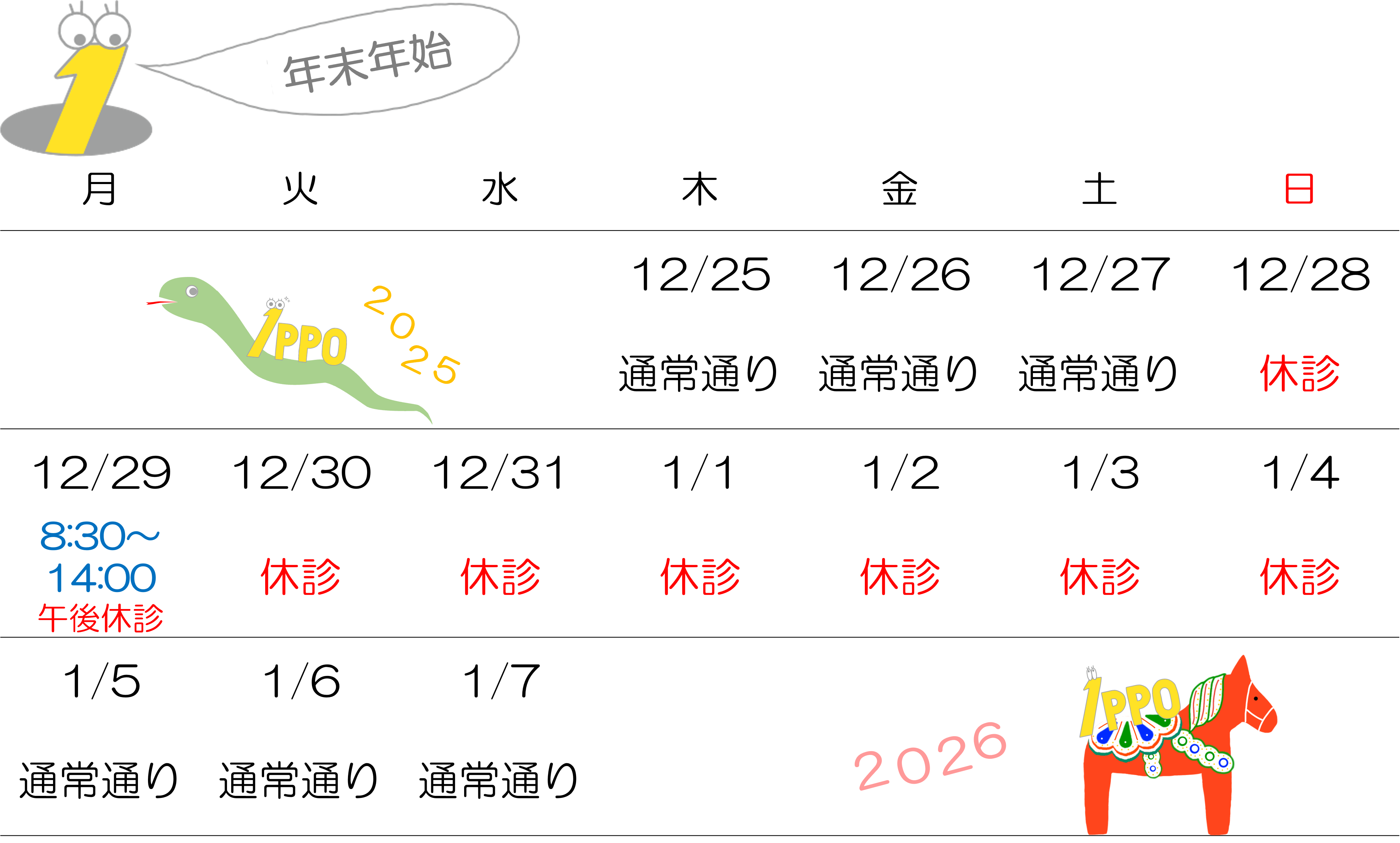 12/28(日)・1/1(木)~4(日)休診、12/29(月)・30(火)通常通り、12/31(水)8:30~12:00診療